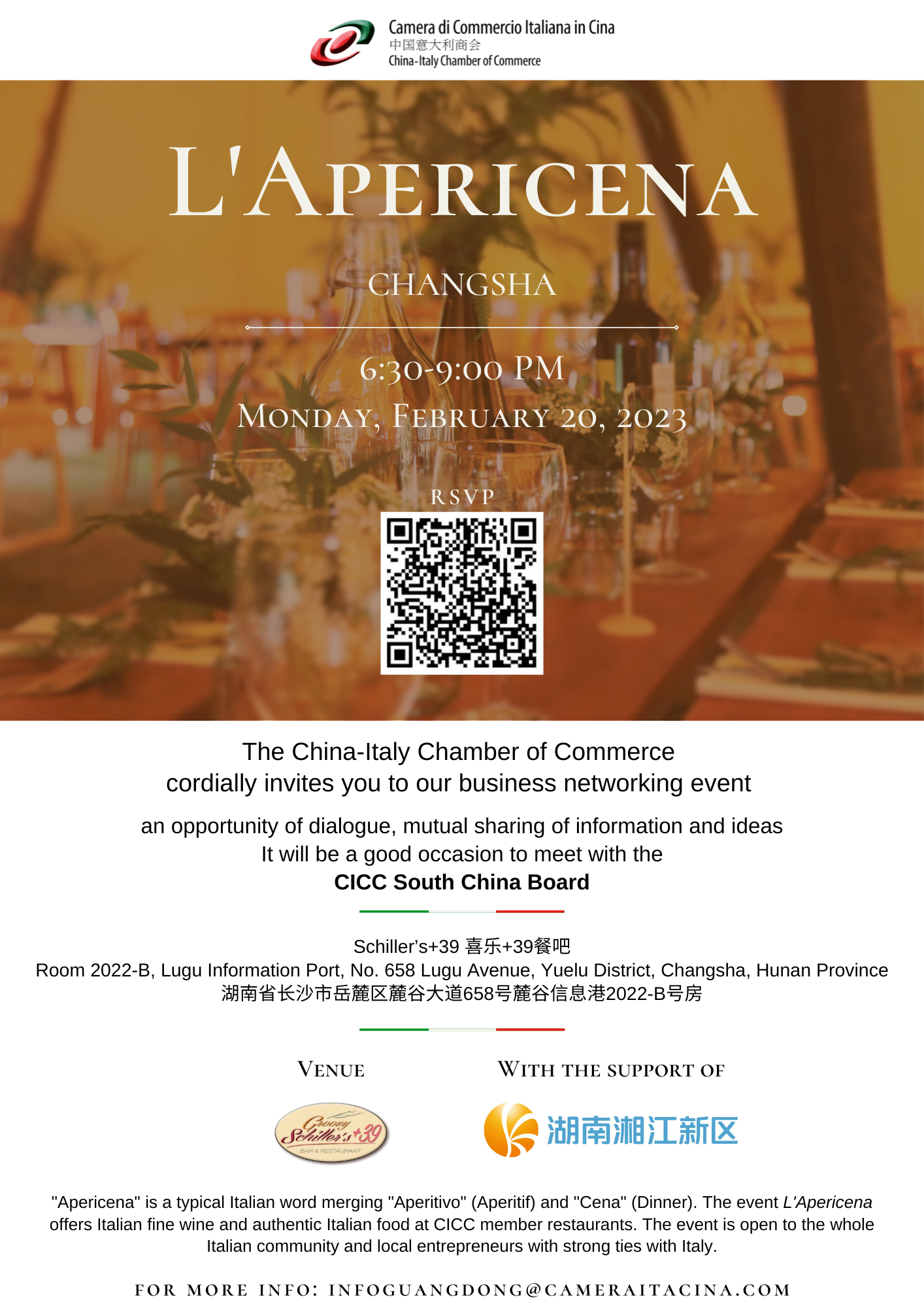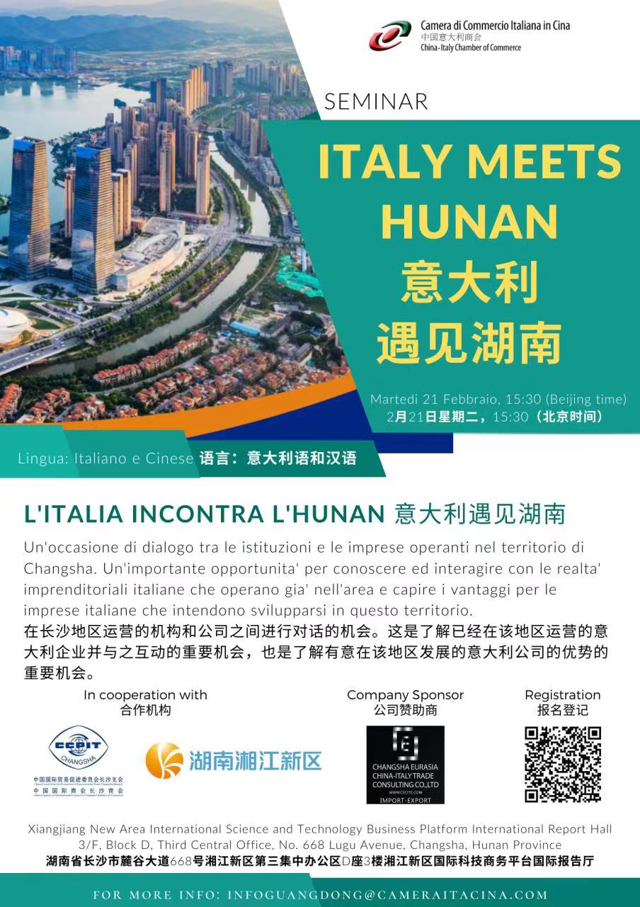 中国意大利商会很高兴邀请您参加 "意大利遇见中国:聚焦长沙 "活动,该活动将于2月21日下午3:30(中国时间)/上午8:30(意大利时间)在湖南湘江新区国际科技商务平台,线上和线下同时举行。