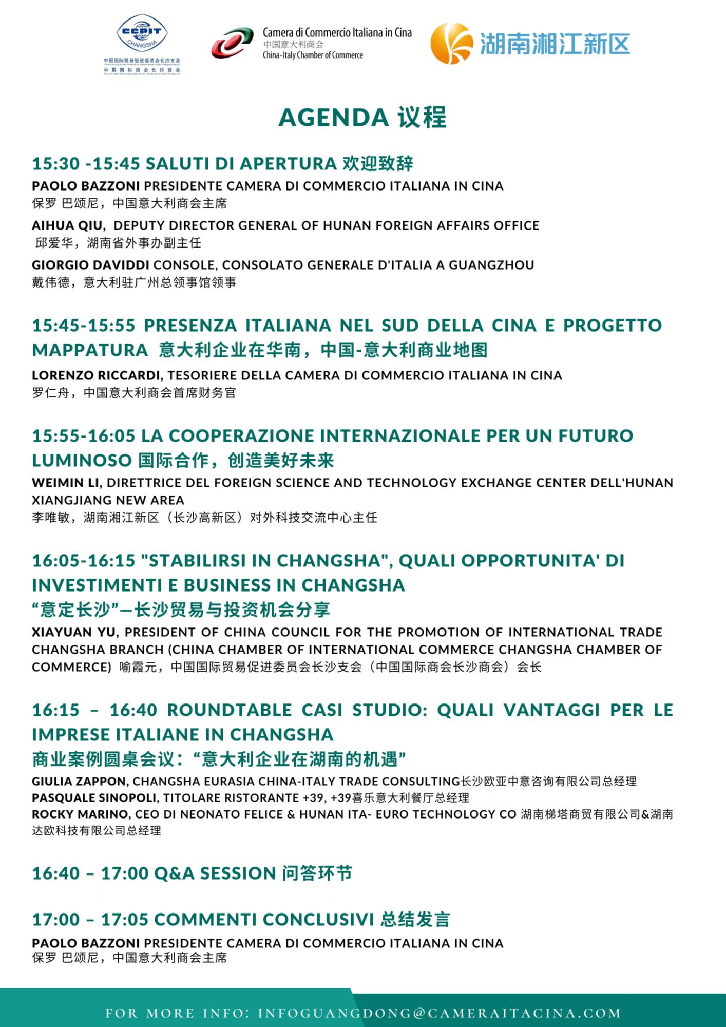本次活动由中国意大利商会主办,意大利驻广州总领事馆、湖南省人民政府外事办公室欧洲事务处、中国国际贸易促进委员会长沙分会和湖南湘江新区管委会联合举办。