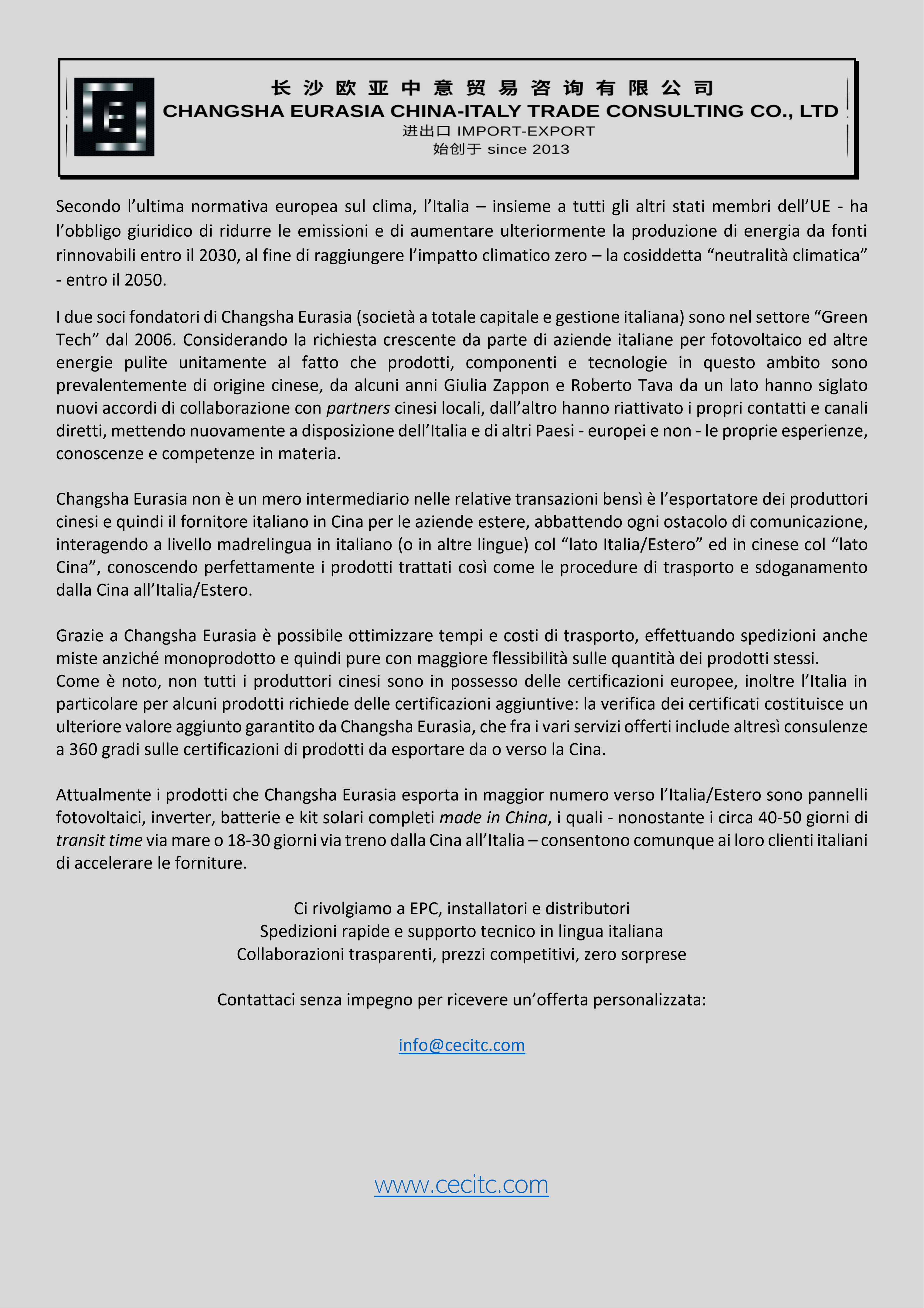 Siamo esportatori di moduli, celle fotovoltaiche, inverter e batterie.