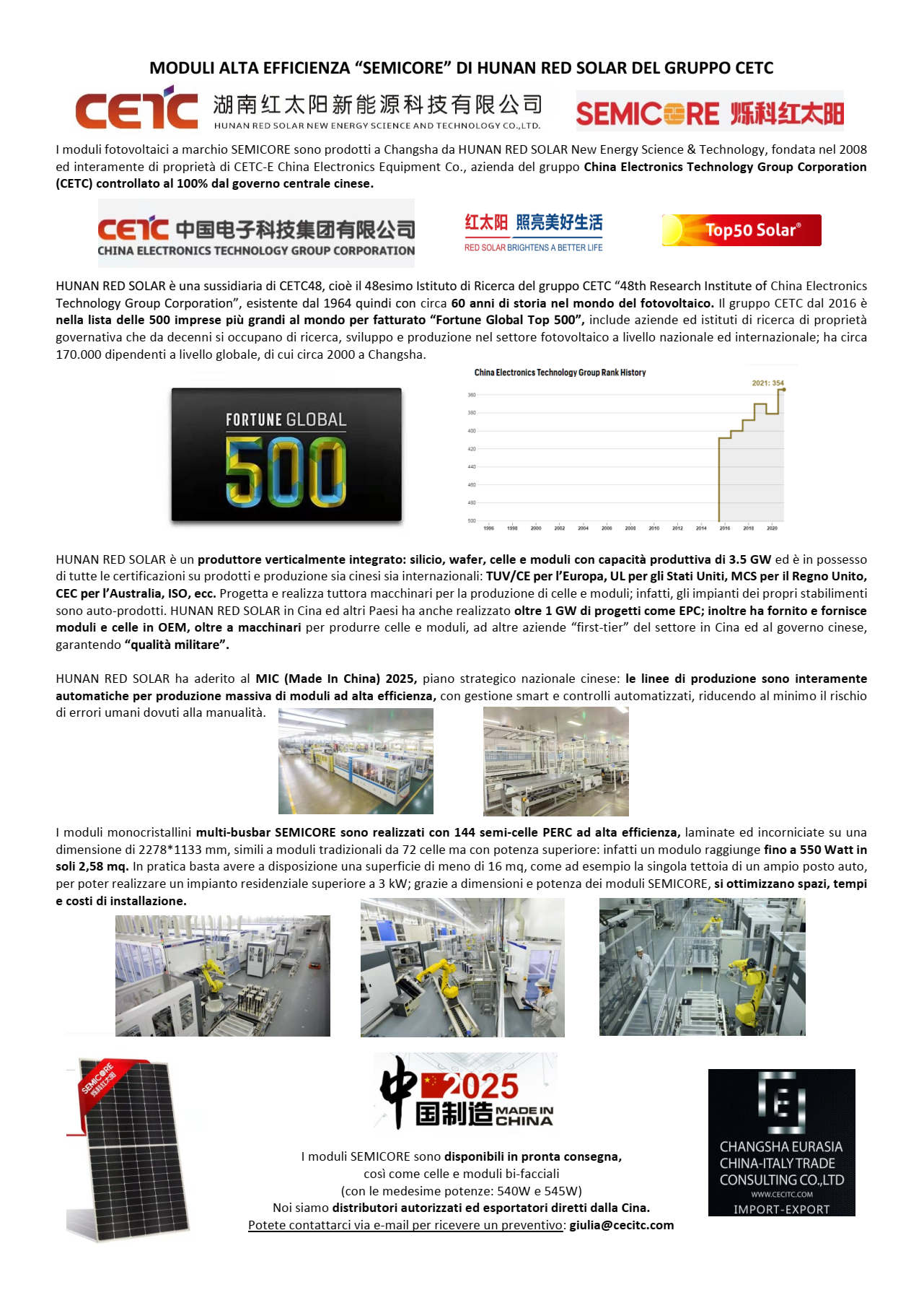 MODULI ALTA EFFICIENZA “SEMICORE” DI HUNAN RED SOLAR DEL GRUPPO CETC